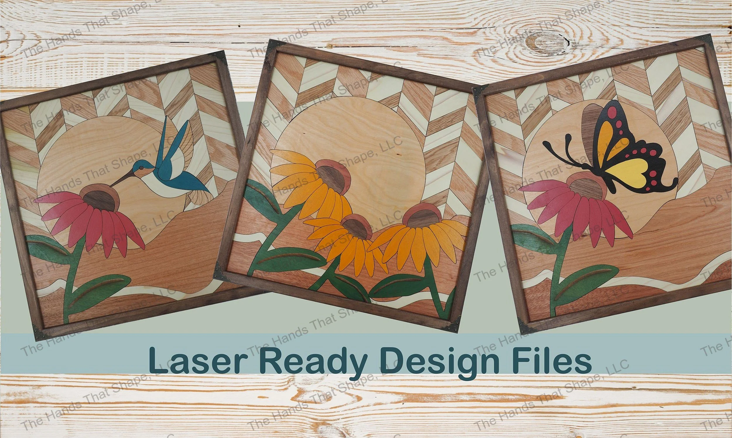 Discover the beauty of nature with our three new laser-ready design files, perfect for creating intricate plywood inlay art pieces. Featuring a coneflower and hummingbird, a coneflower and butterfly, and three coneflowers together, these 16"x16" art pieces boast a chevron background and a large sun for added visual appeal. Unleash your creativity and craft stunning wooden masterpieces that celebrate the delicate grace of the natural world.